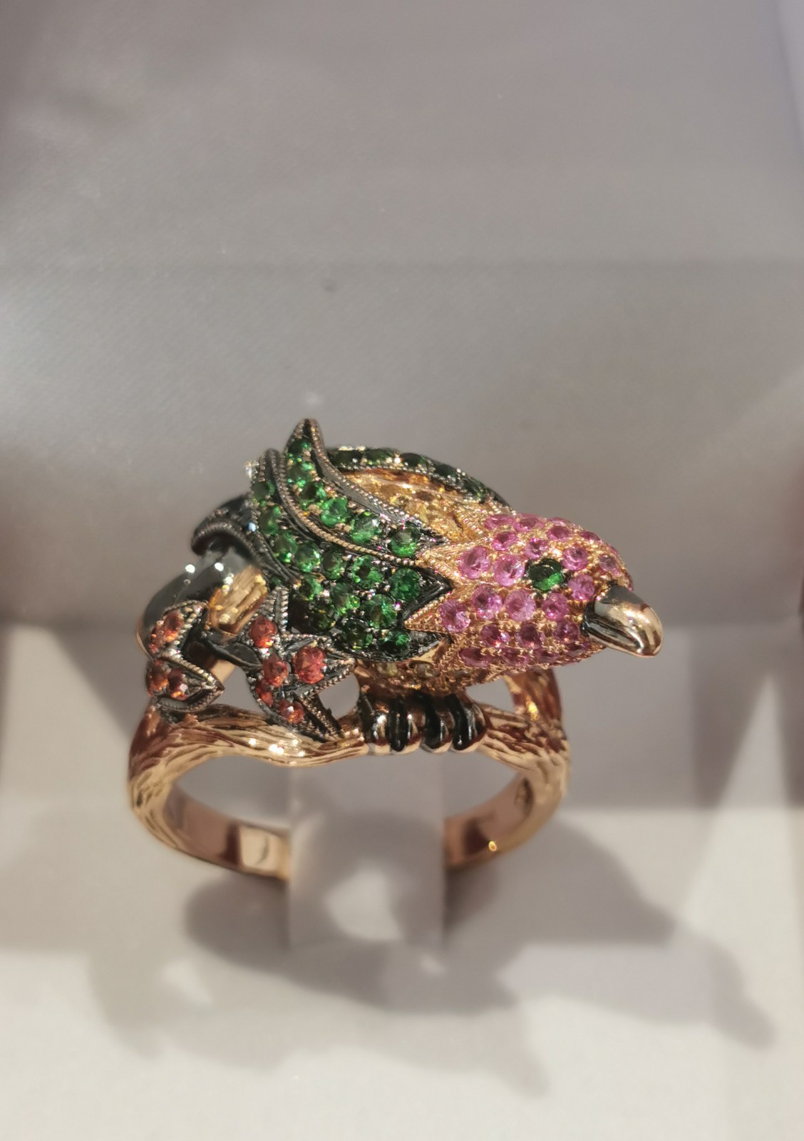 Magnifique bague ancienne avec pierres précieuses et or, représenté par un oiseau à vendre chez city gold a sète