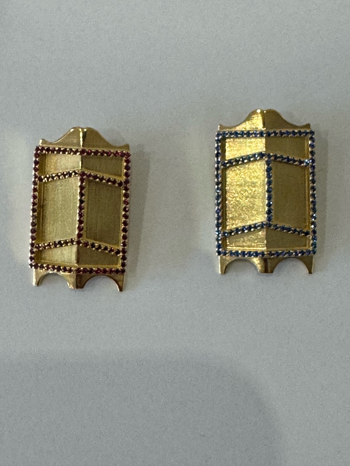 Nouvelle entrée de pavois, or 18 carats serti de strasse de Swarovski, couleur rouge et bleu, représentant les pavois de Sete